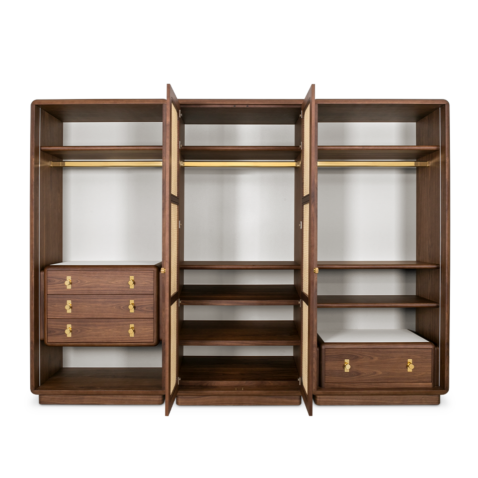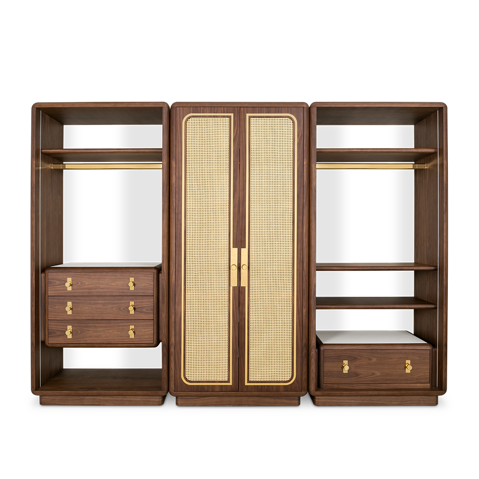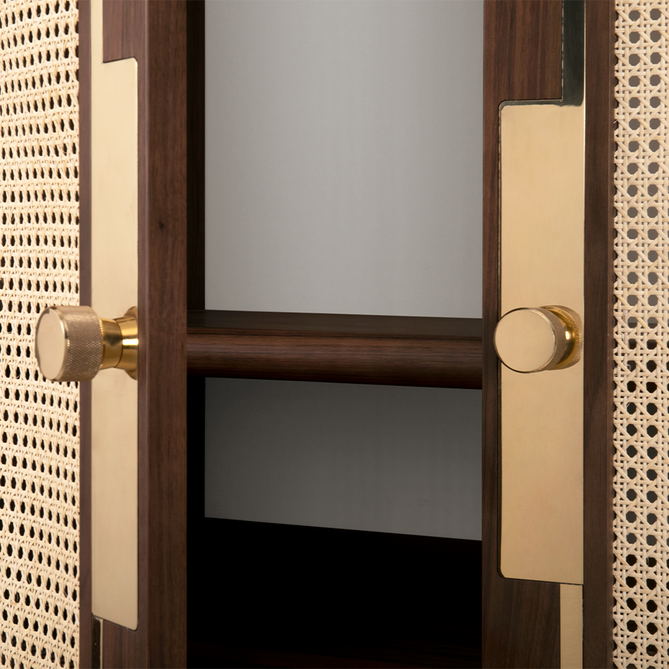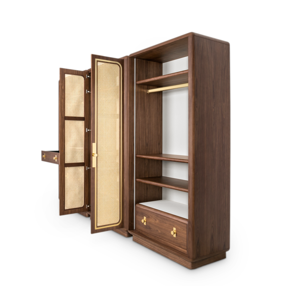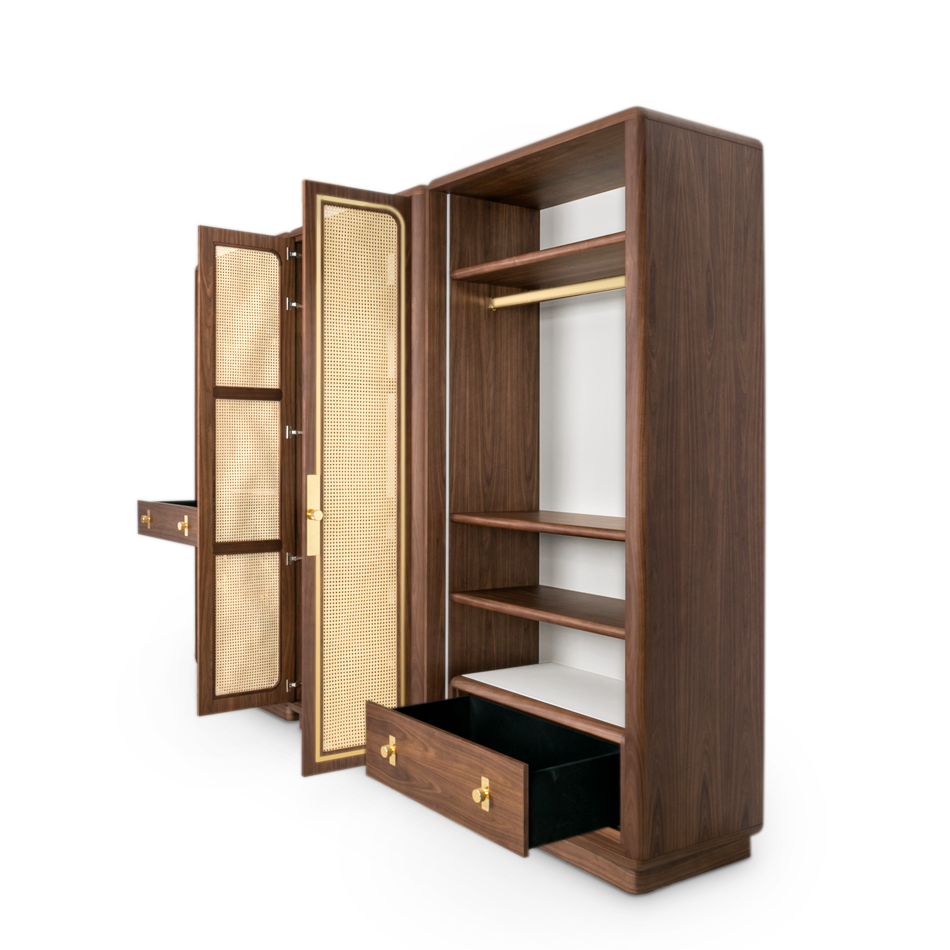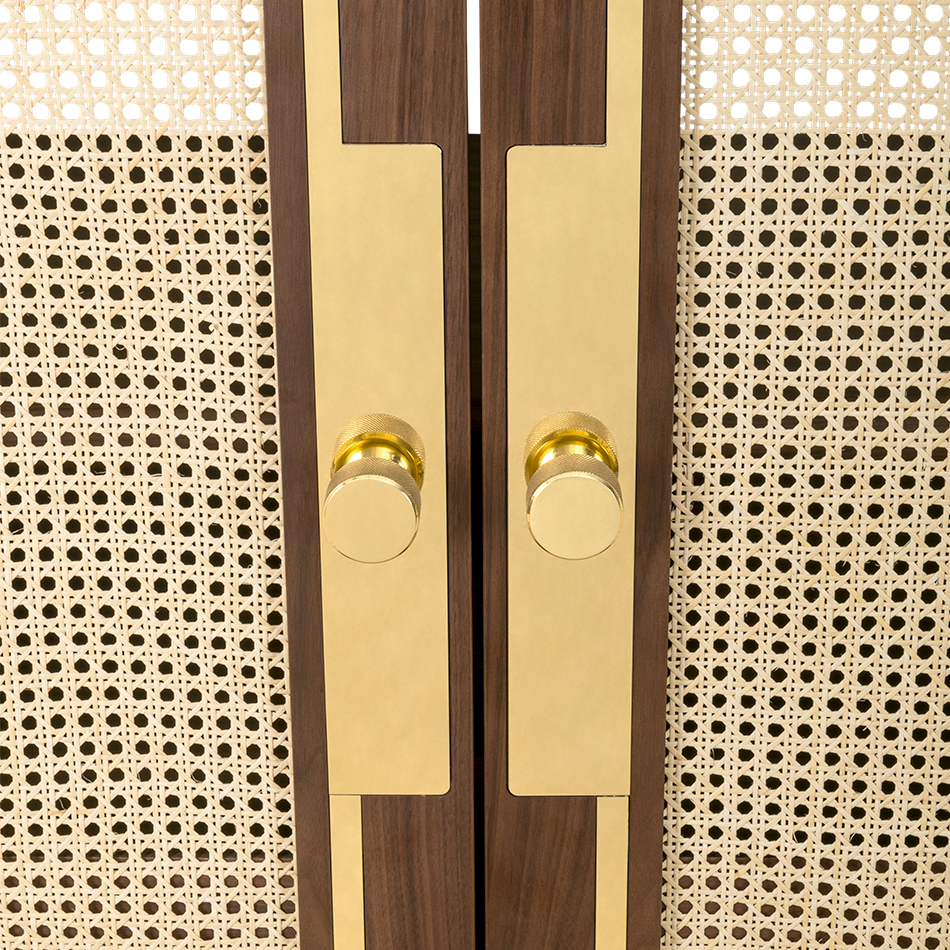 Feel like a 60's Hollywood star with the stunning mid-century Franco closet. Crafted in varnished wood, straw, and metallic details, it exudes classic beauty and authenticity. This closet is perfect for showcasing your favorite fashion pieces, bringing a whole new level of mid-century modern design into your intimate space.