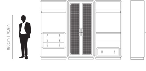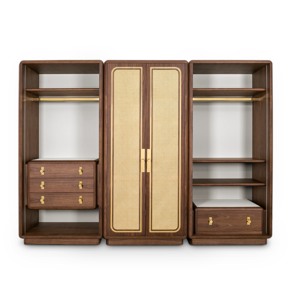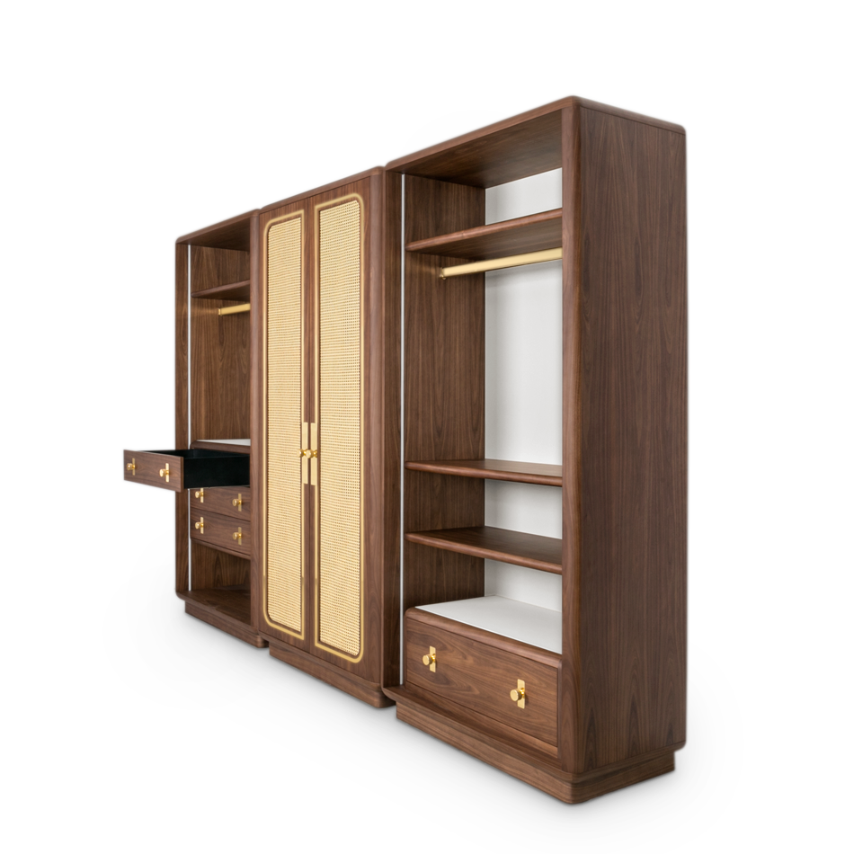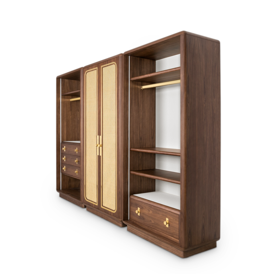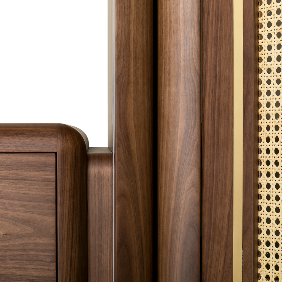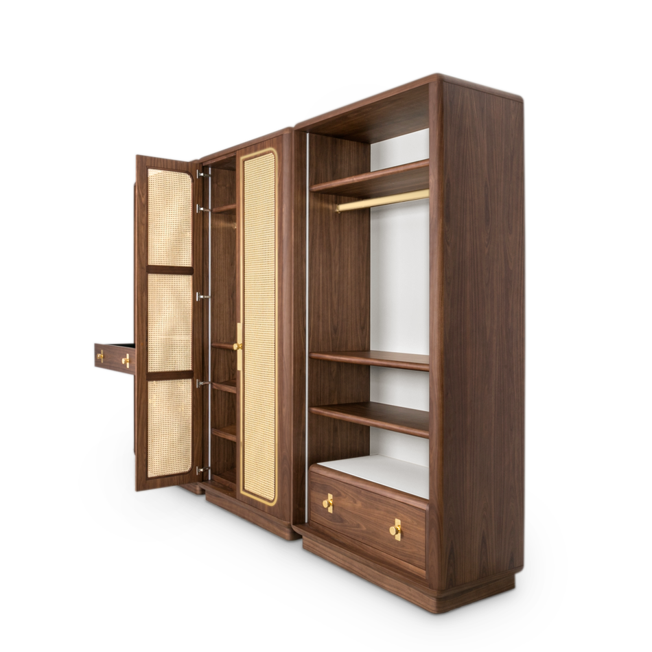 Feel like a 60's Hollywood star with the stunning mid-century Franco closet. Crafted in varnished wood, straw, and metallic details, it exudes classic beauty and authenticity. This closet is perfect for showcasing your favorite fashion pieces, bringing a whole new level of mid-century modern design into your intimate space.