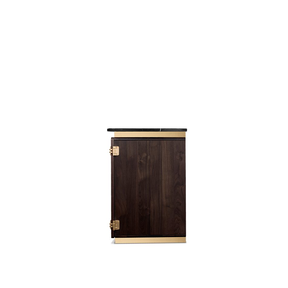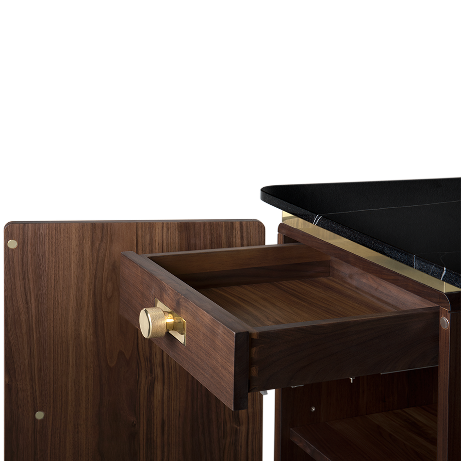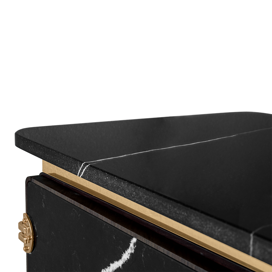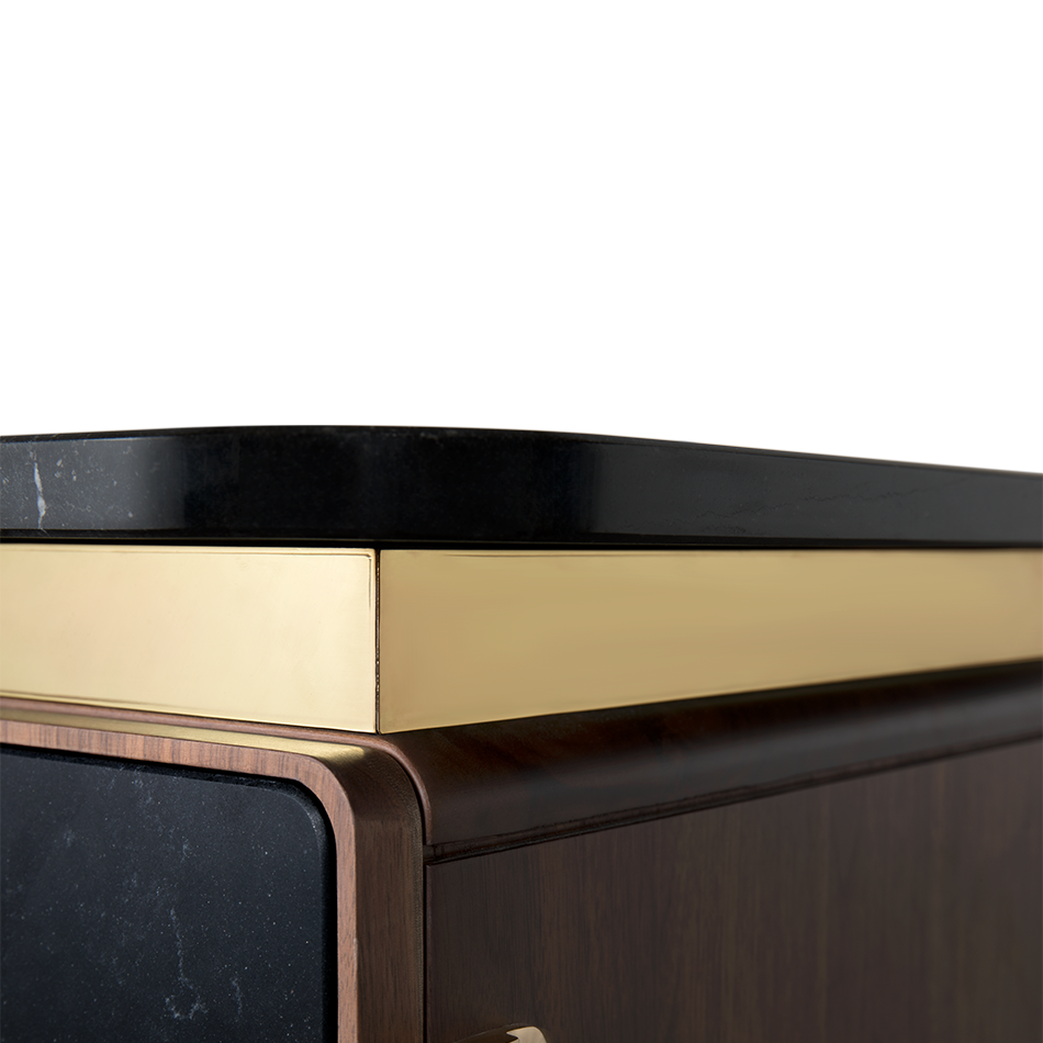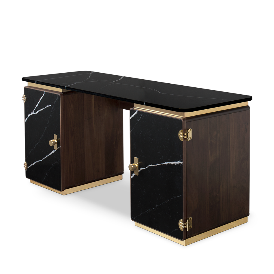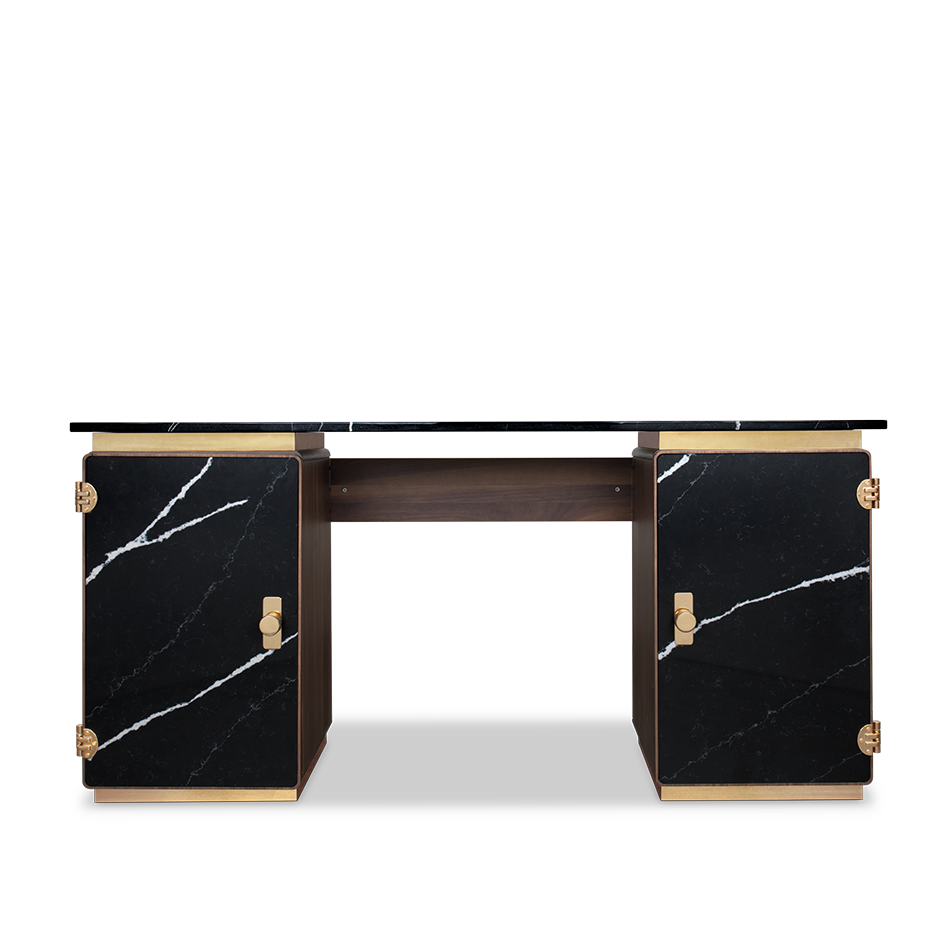 A writing desk with a soulful and sleek visual — Clean and Monolithic. It features two cubic towers crafted from varnished walnut veneer with two doors made out of Nero Marquina Marble made to impress. Brass details were added to the base and below the marble countertop, producing a soulful and sleek visual to the desk.