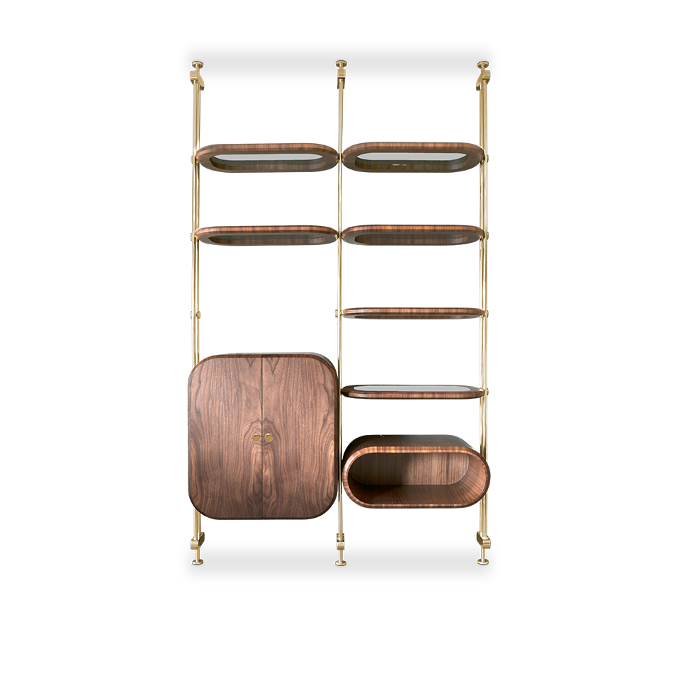 Part of the Minelli family, this bookcase is perfect for any mid-century lover. It's a furniture piece that definitely calls attention in the best way, providing elegance and space with its walnut wood and smoked glass shelves, as well as a whole structure built in polished brass. Ready to be enchanted by Minelli bookcase?