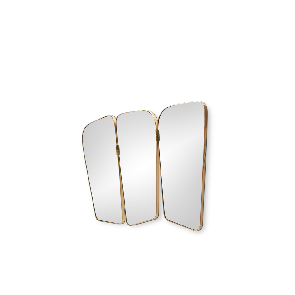 A beautifully designed vanity wall mirror. It features three panels and an irregular shape with a golden strap of plated brass that evokes a mid-century modern style. It can be hung above a sideboard or a console and still give that retro look to your bedroom or living room.