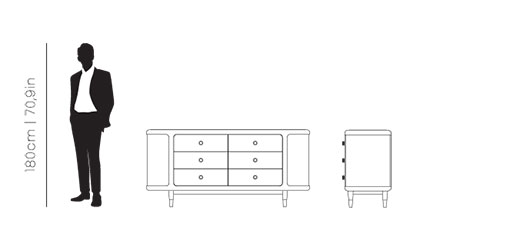 The Franco Sideboard pays homage to Scandinavian and mid-century design, captivating with its clean lines and solid wood structure. With a simple silhouette, legs featuring metal tips, rattan grills on the sides, and six large drawers, this sideboard is a true definition of Mid-Century Modern.