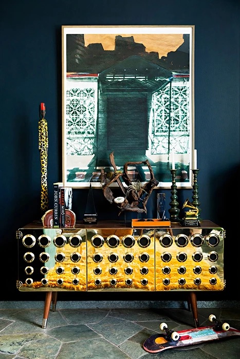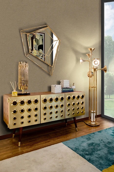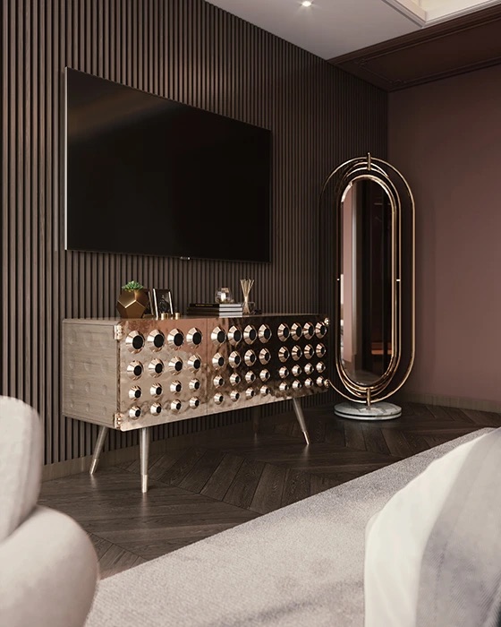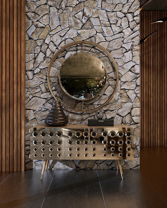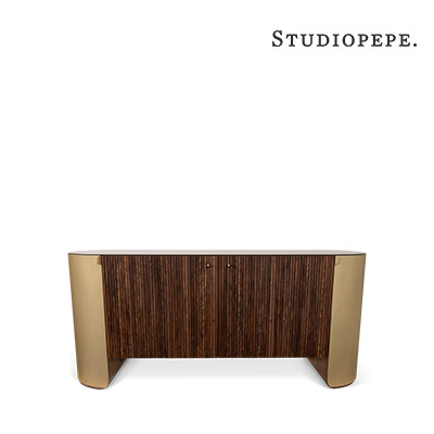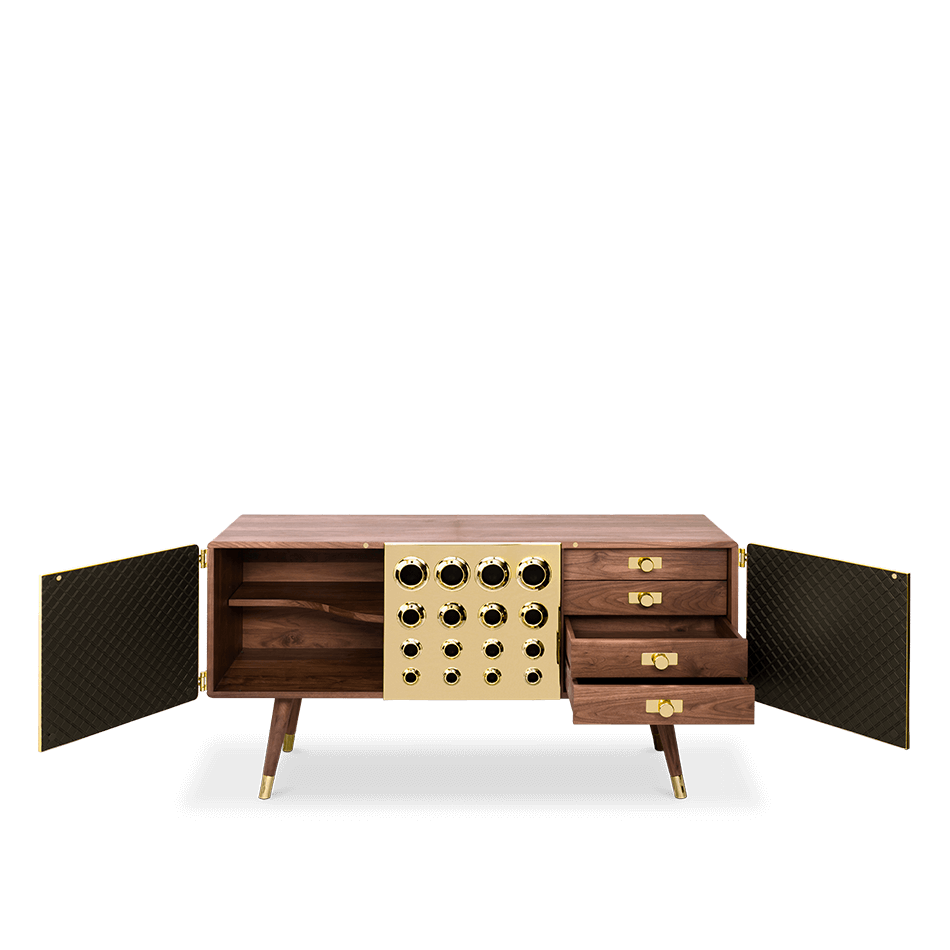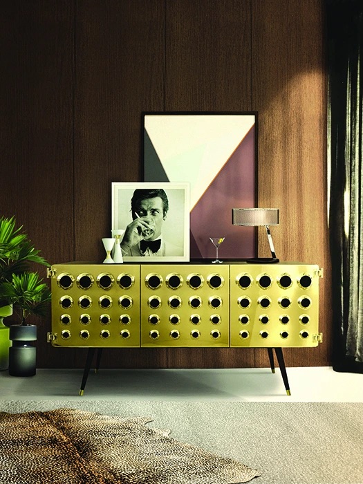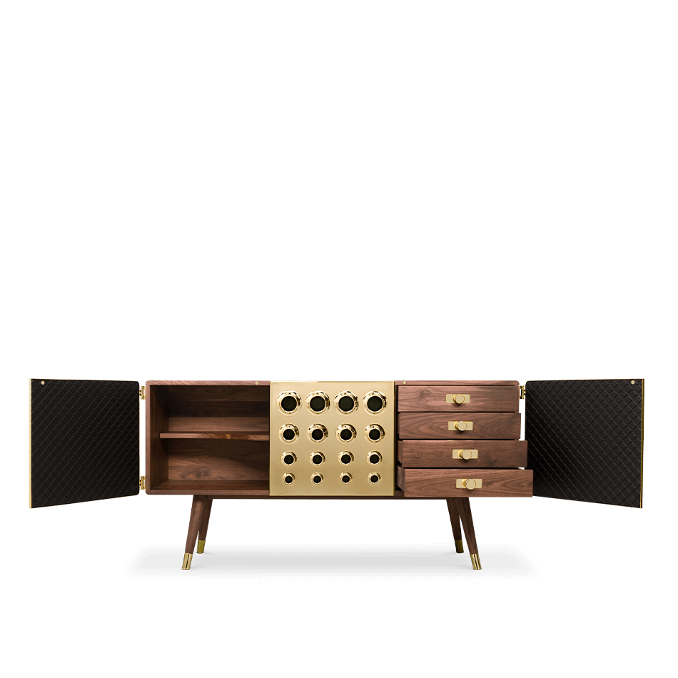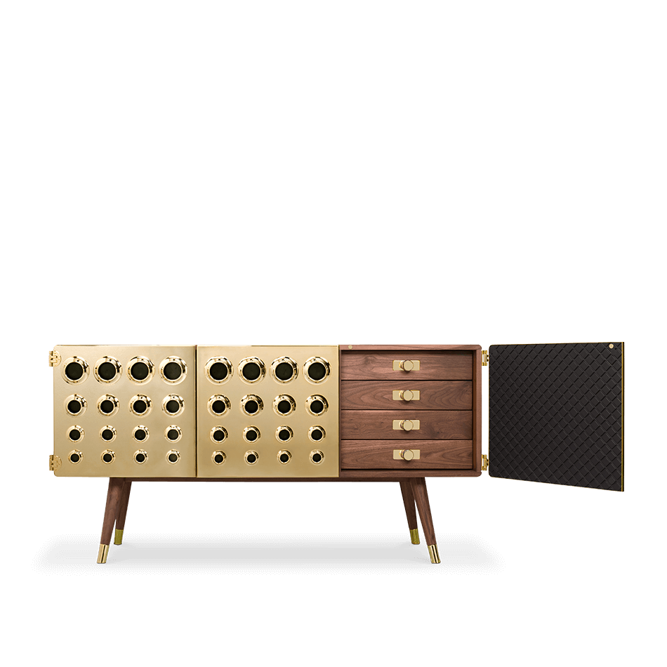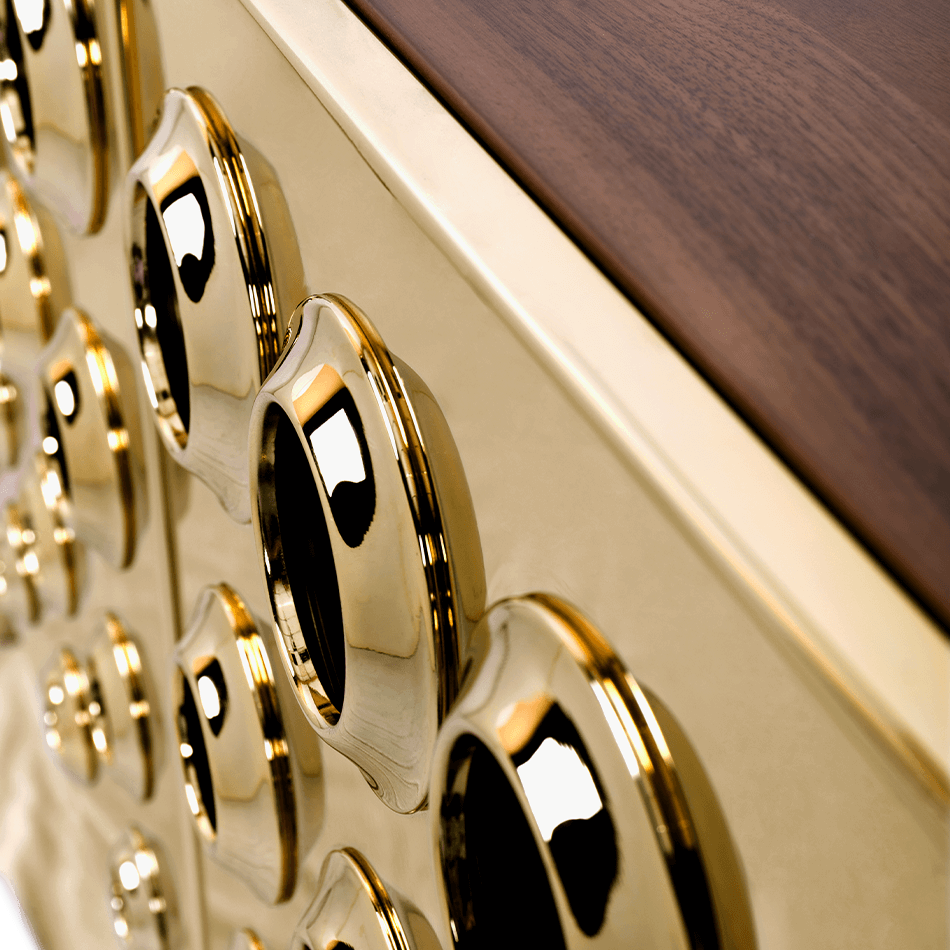 Monocles is a charming and luxurious furniture piece with a strong mid-century appeal. Its metal doors and engraved circles on the wood structure create a unique and characterful design, inspired by the iconic gun barrel scene from the Bond movies, making it a perfect choice for retro and mid-century enthusiasts.