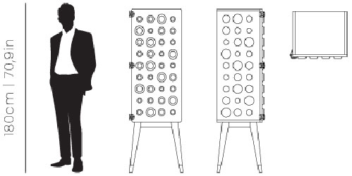 A stylish and functional furniture that blends mid-century charm with a contemporary design style. Monocles features tapered legs with brass ferrules and a body built in solid walnut wood, both sides and back engraved with stunning circles inspired by the mid-century style.