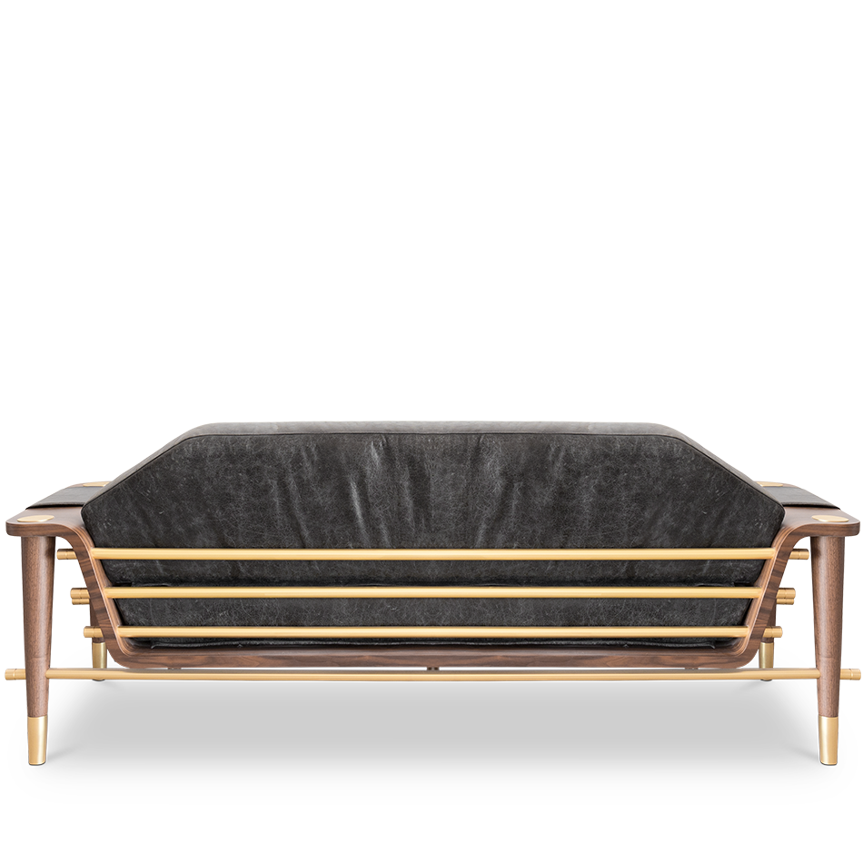 Perfect for a private lounge, Curtis, a modern sofa with a long dark wooden bench, embodies mid-century elegance. Upholstered in soft tufted fabric, it features a single back cushion and side tables. Round tapered legs with metallic details and feet, gives contrast to the dark wooden tones.