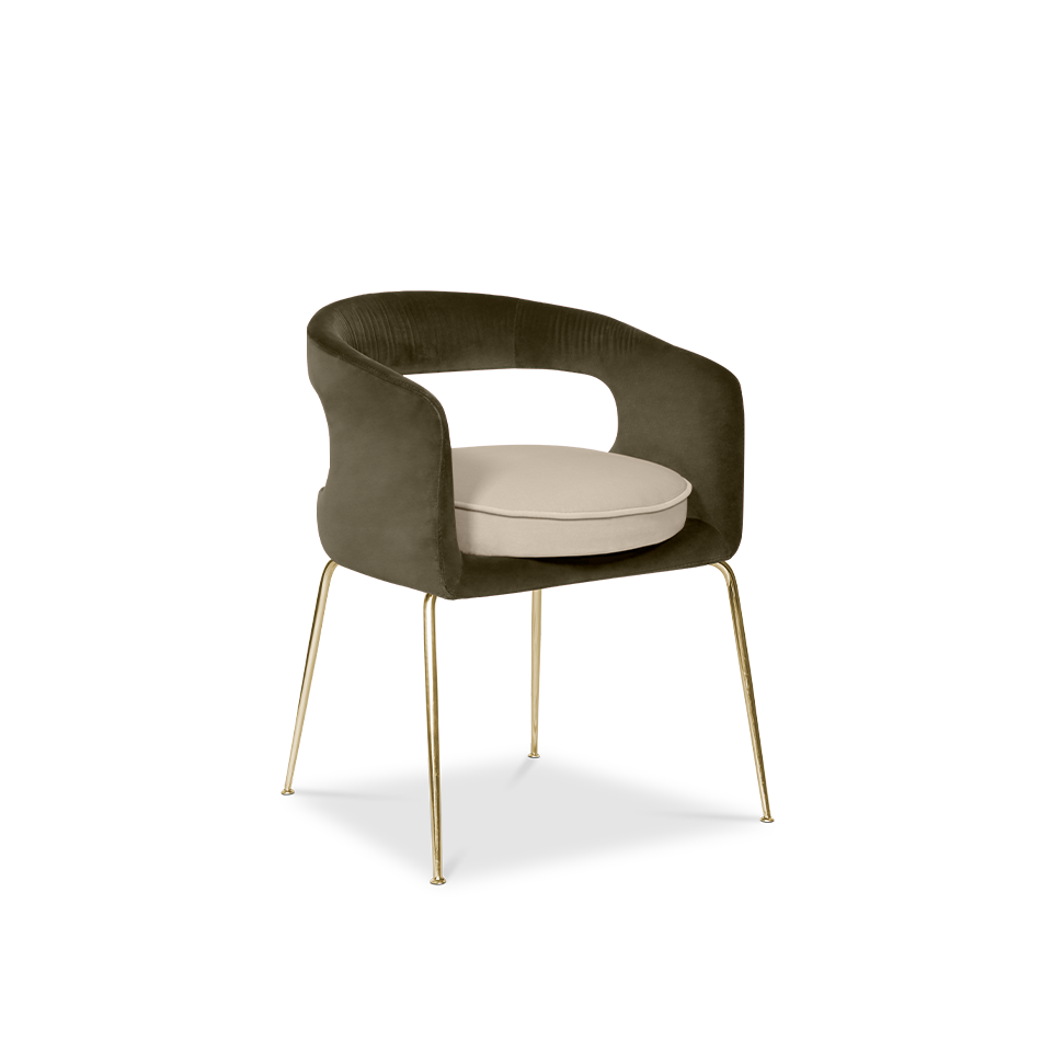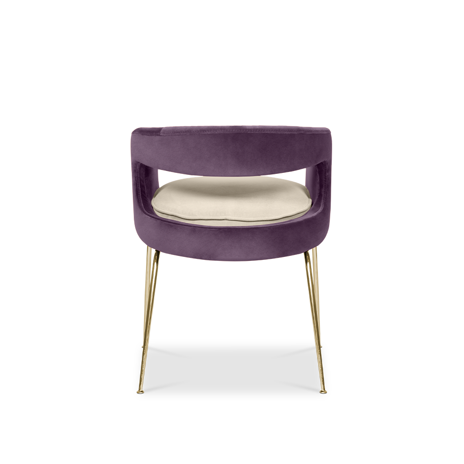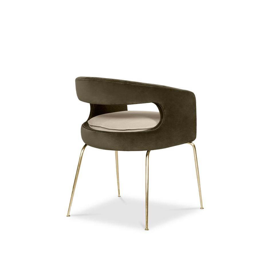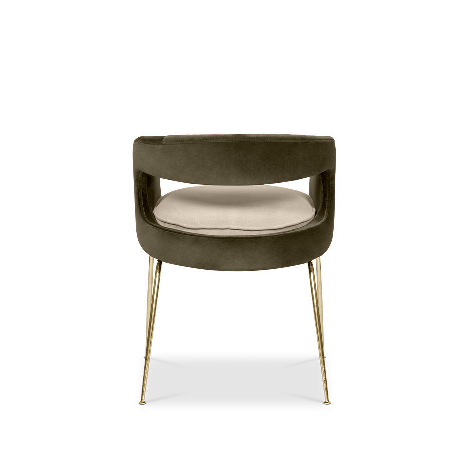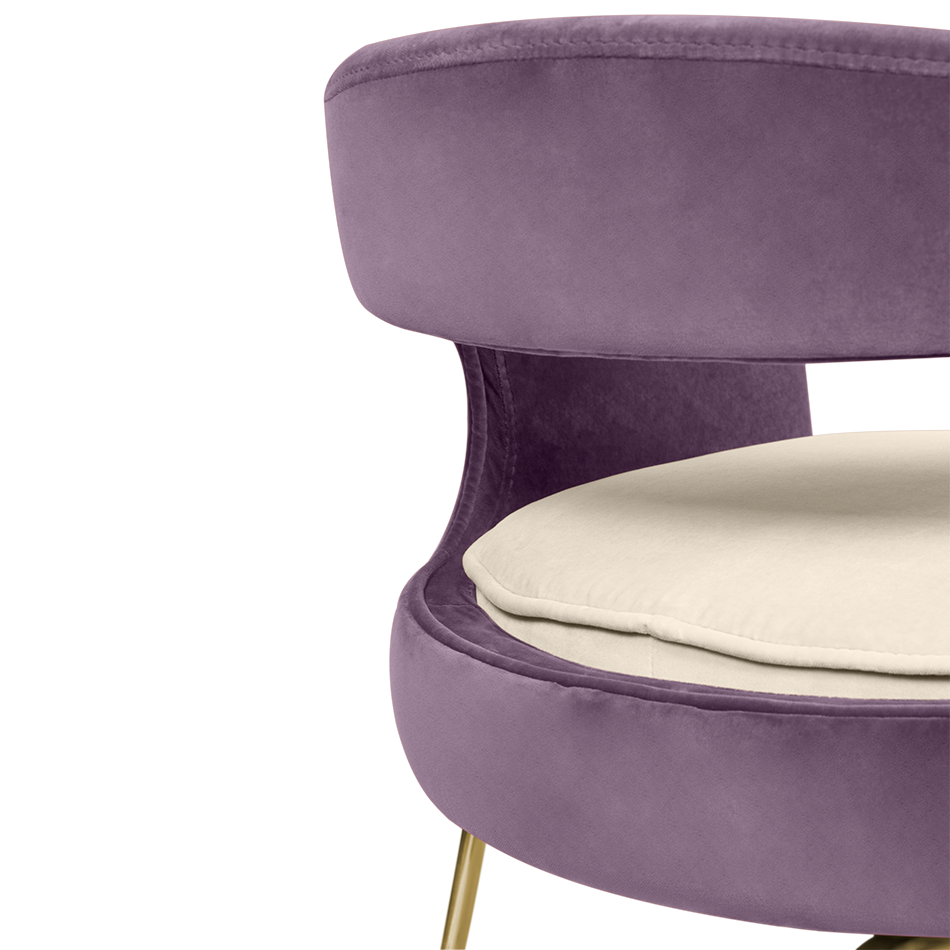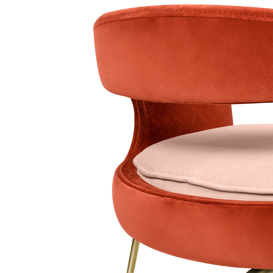 A fanciful dining chair full of luxurious features that will bring personality and uniqueness to your dining room. It is upholstered in velvet and has mixed tones both on the back and the round cushioned pad. Extremely sculptured, and it contrasts with the slim legs made of polished brass.
