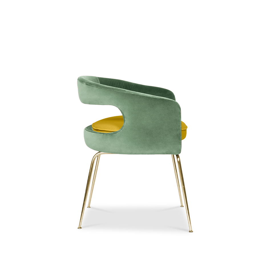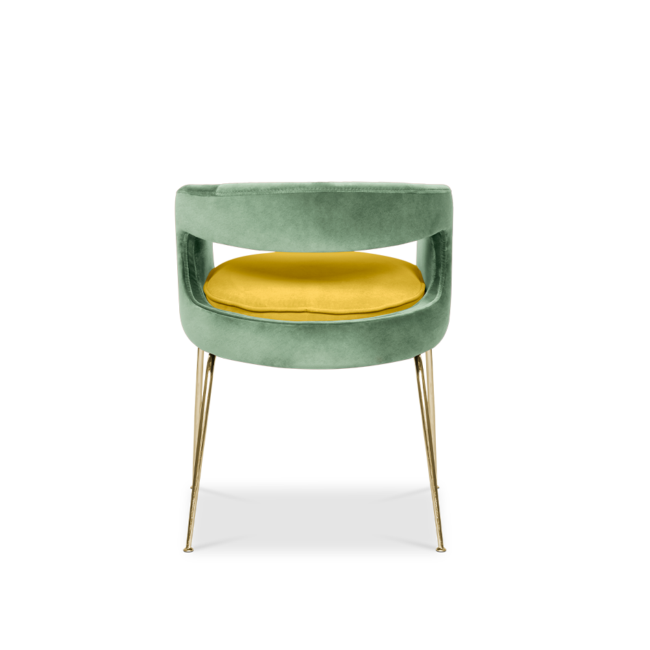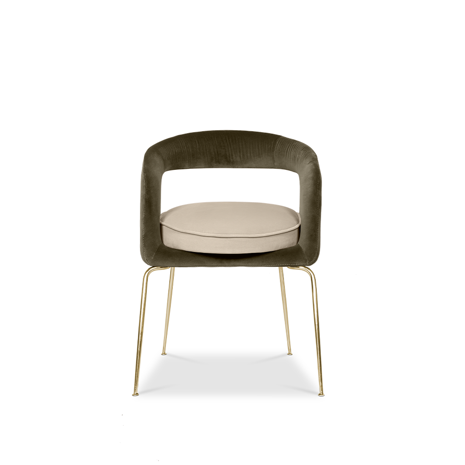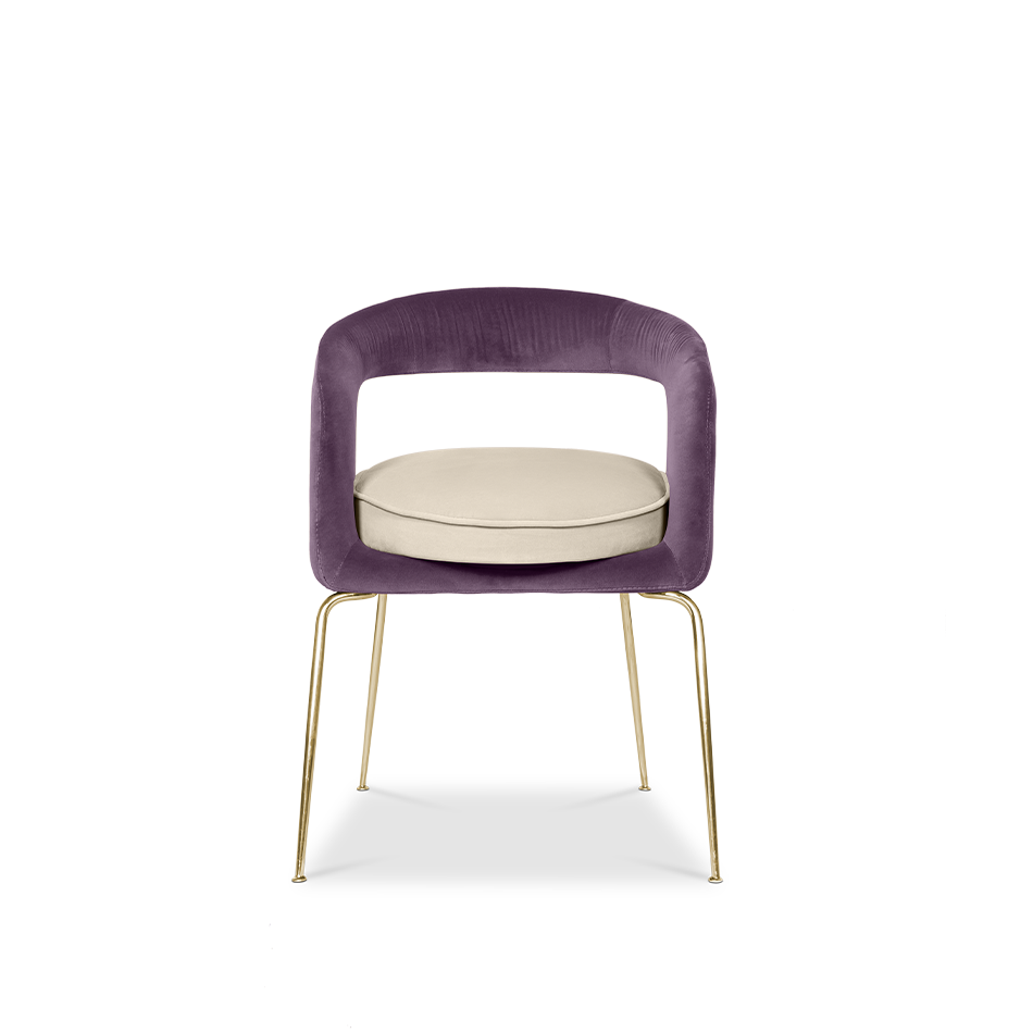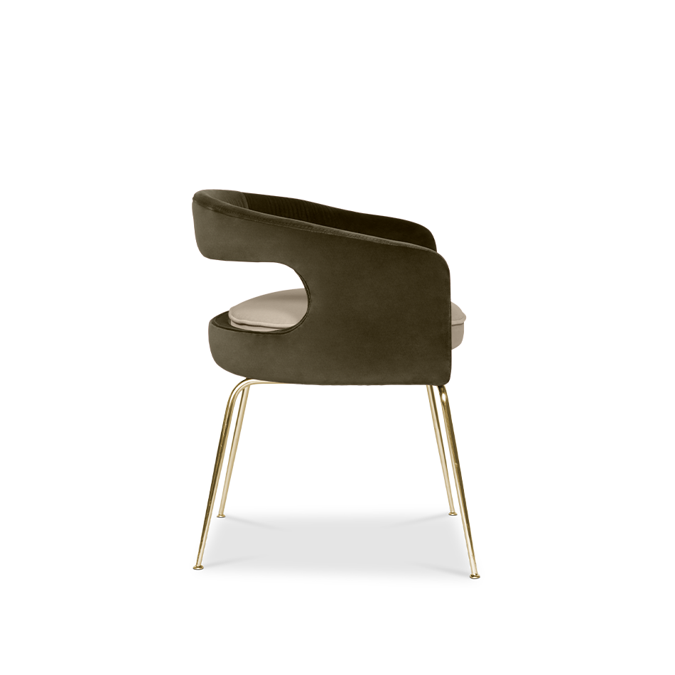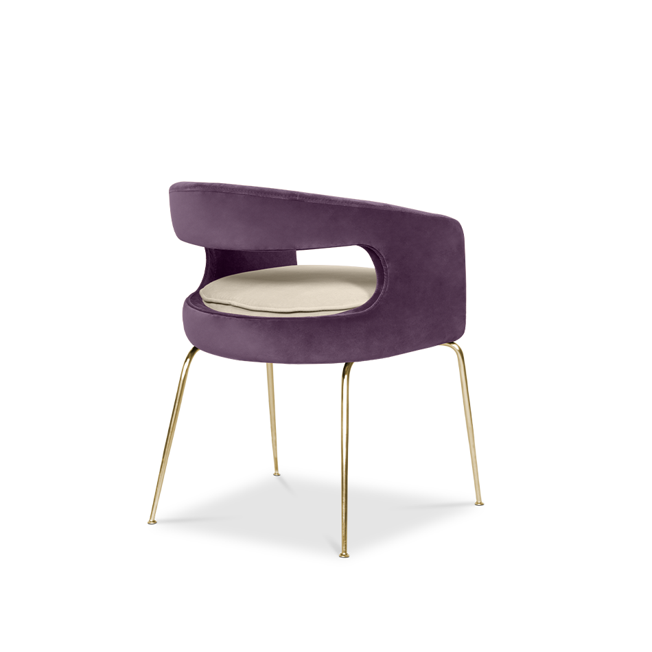 A fanciful dining chair full of luxurious features that will bring personality and uniqueness to your dining room. It is upholstered in velvet and has mixed tones both on the back and the round cushioned pad. Extremely sculptured, and it contrasts with the slim legs made of polished brass.