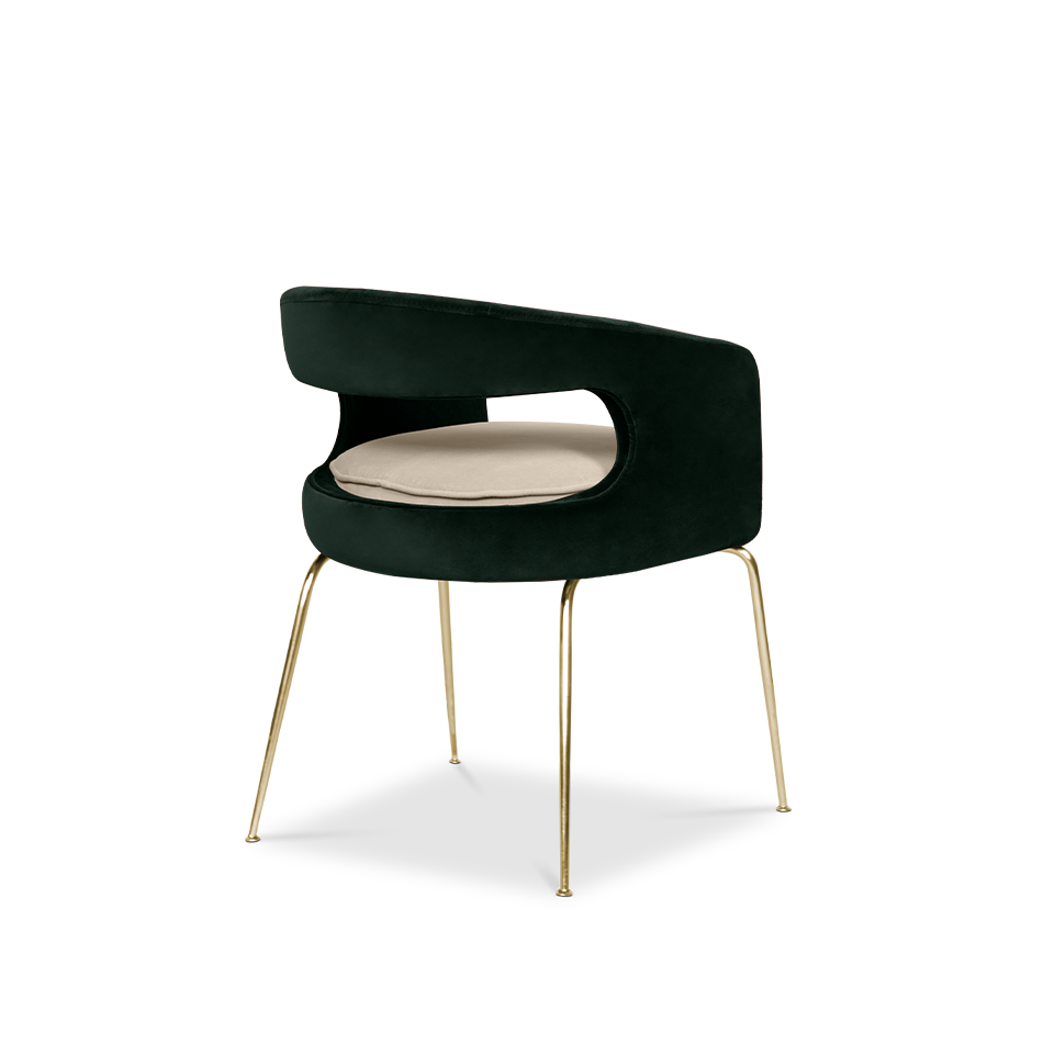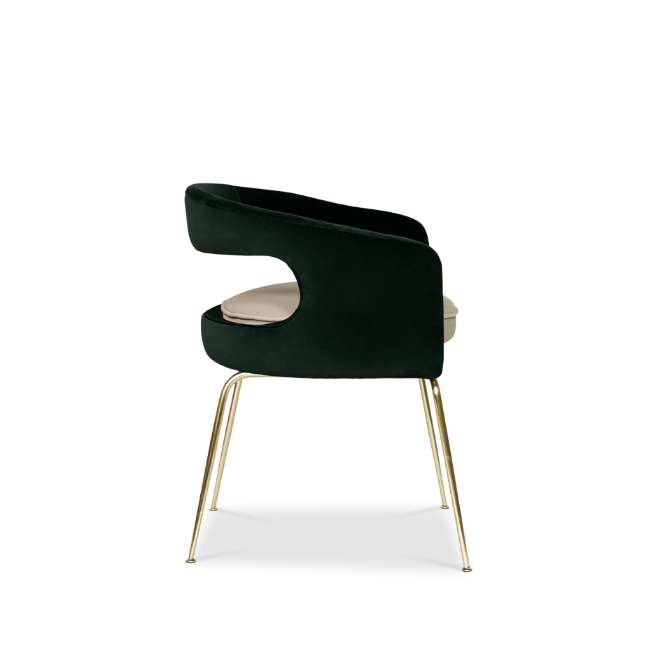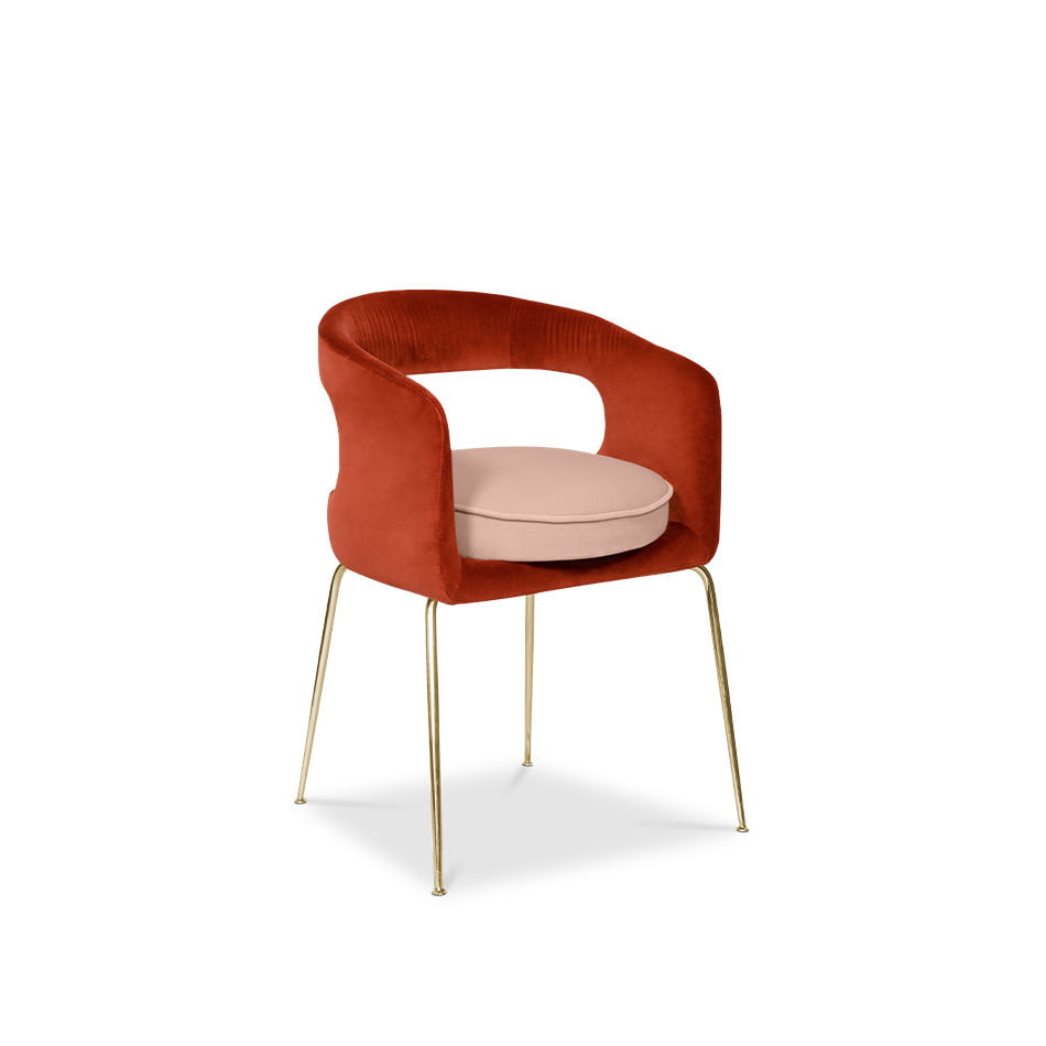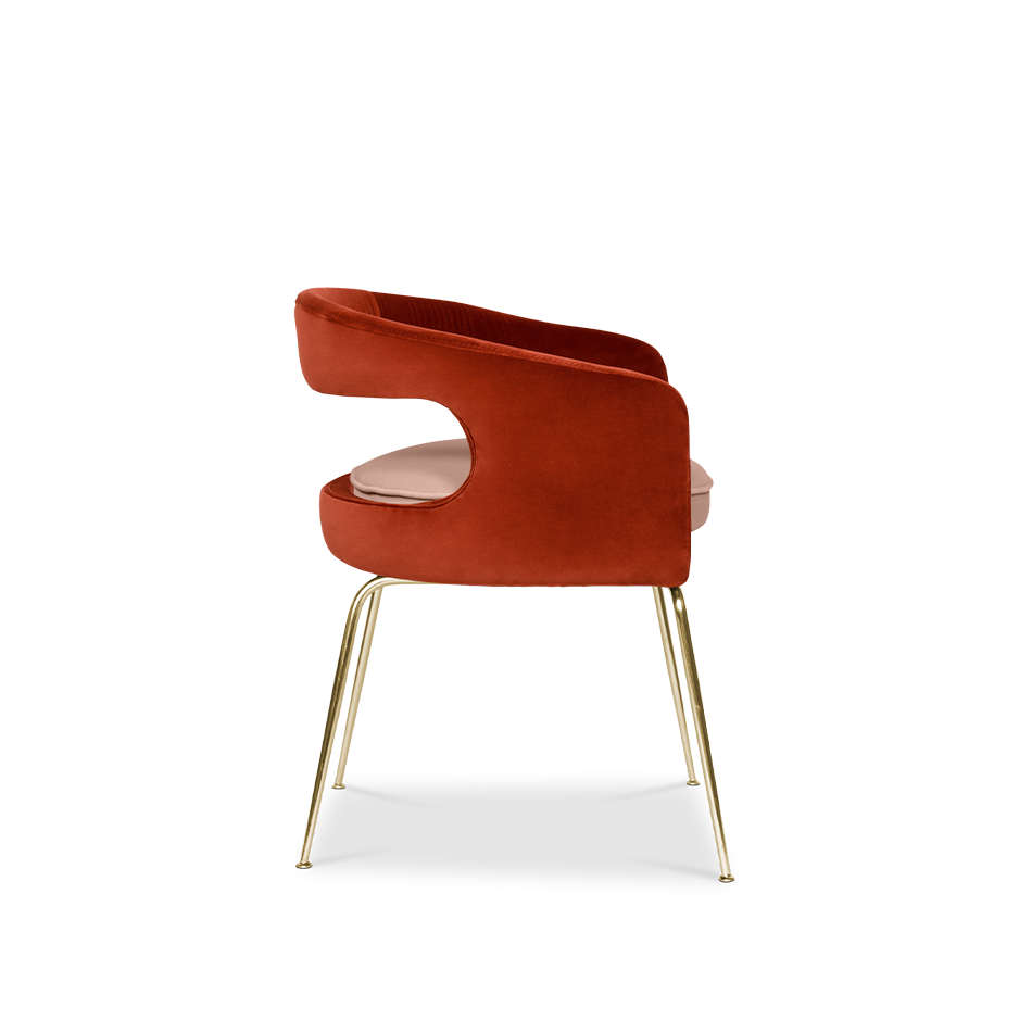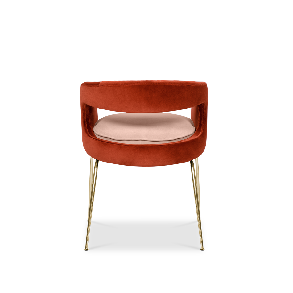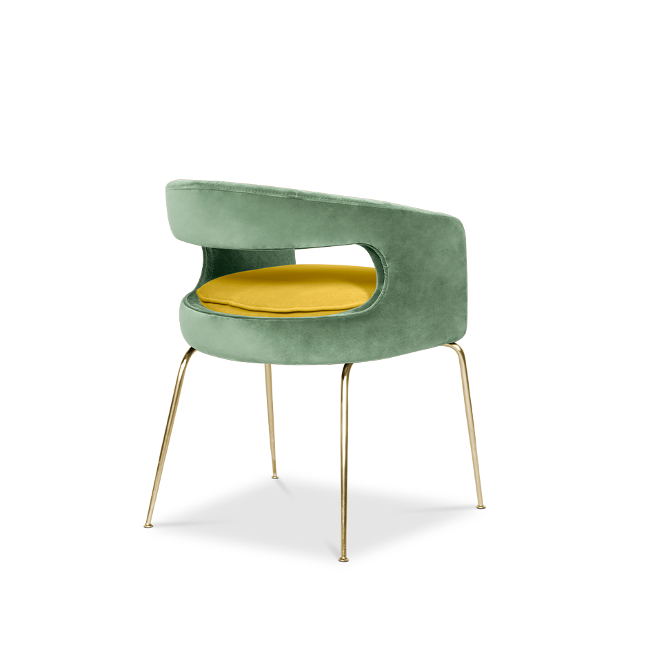 A fanciful dining chair full of luxurious features that will bring personality and uniqueness to your dining room. It is upholstered in velvet and has mixed tones both on the back and the round cushioned pad. Extremely sculptured, and it contrasts with the slim legs made of polished brass.