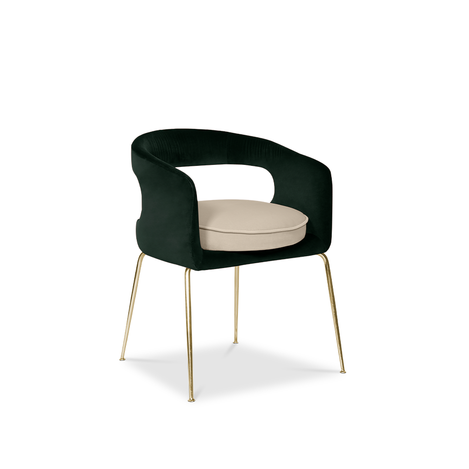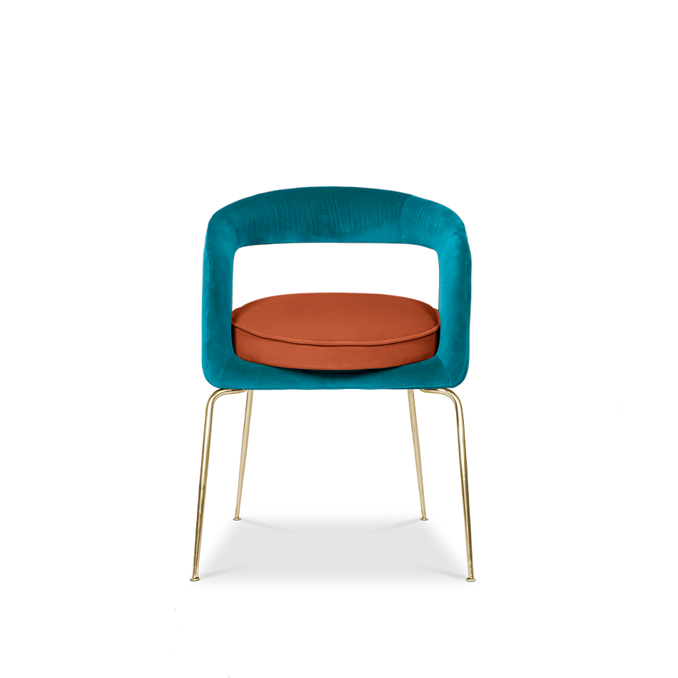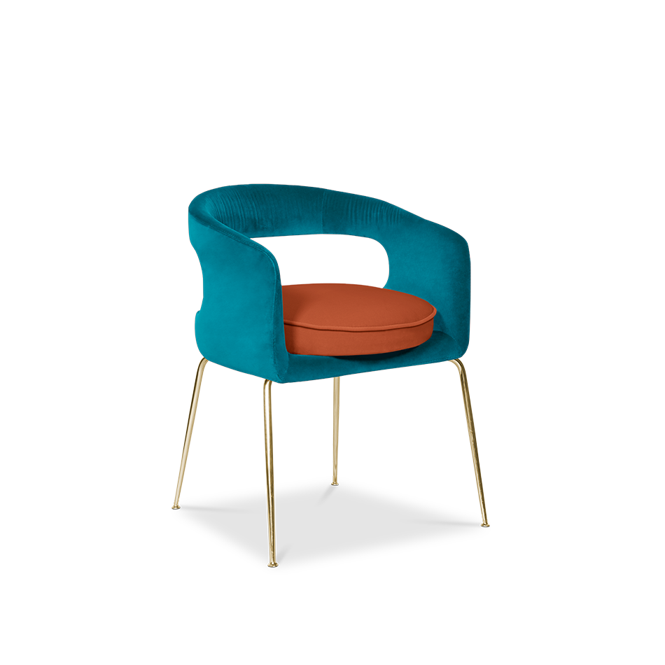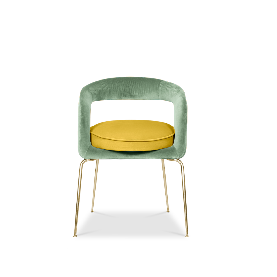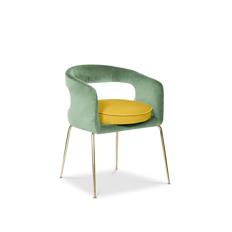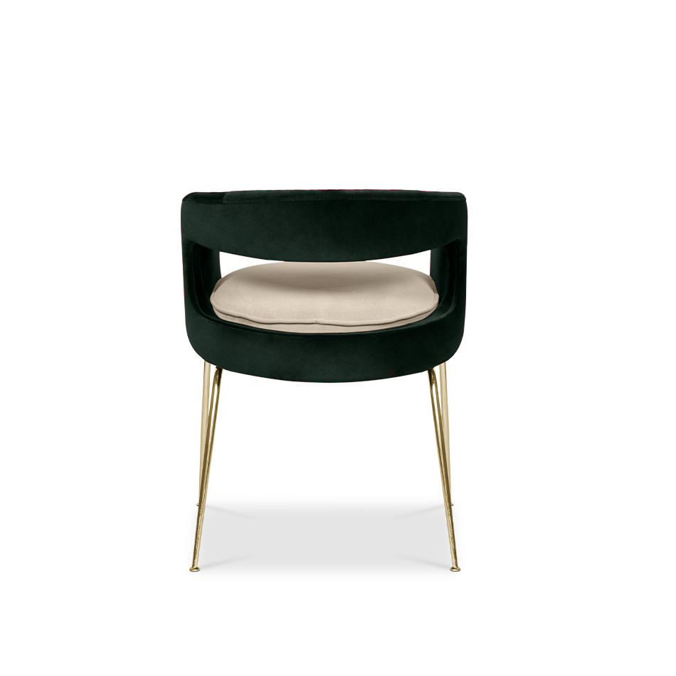 A fanciful dining chair full of luxurious features that will bring personality and uniqueness to your dining room. It is upholstered in velvet and has mixed tones both on the back and the round cushioned pad. Extremely sculptured, and it contrasts with the slim legs made of polished brass.