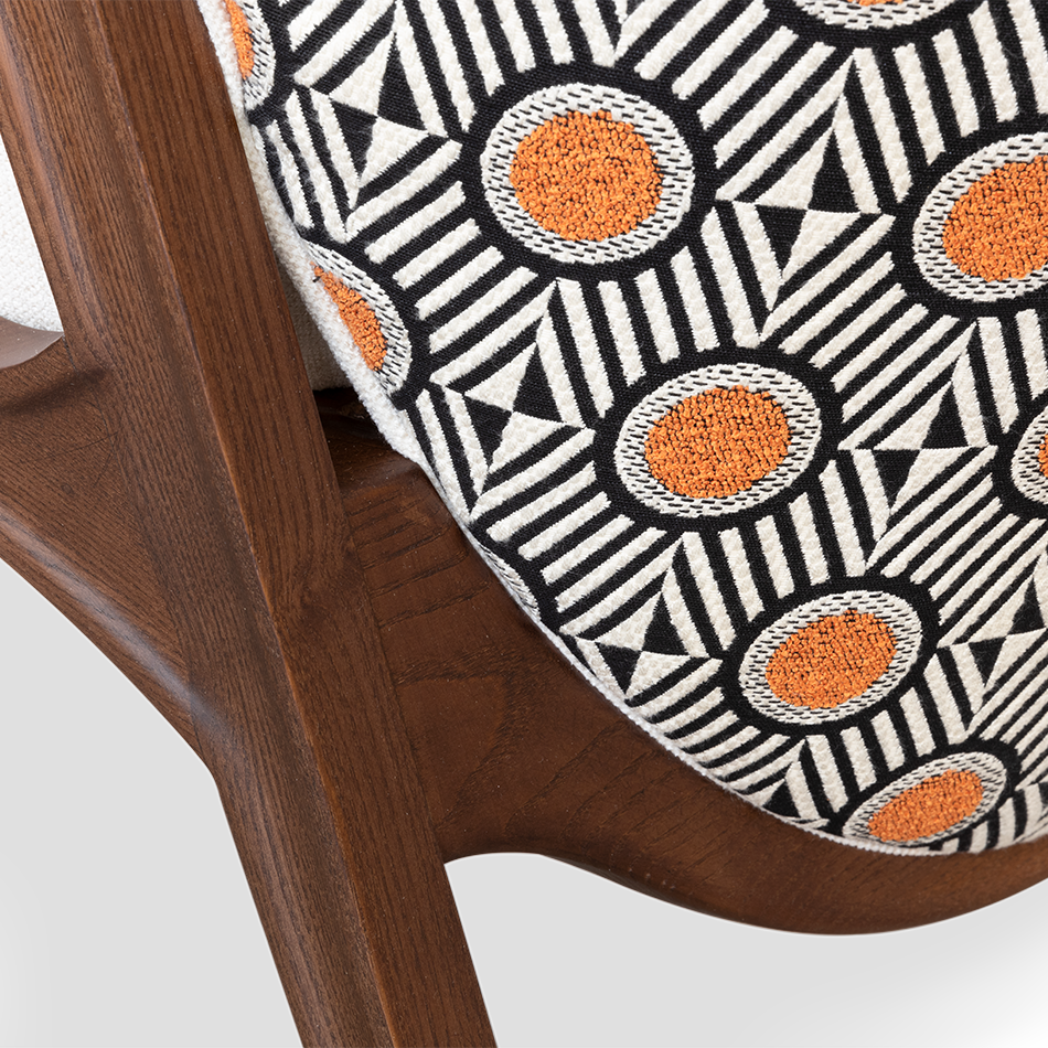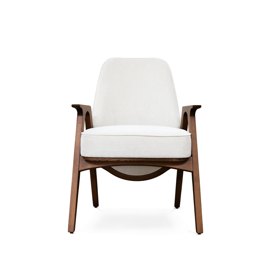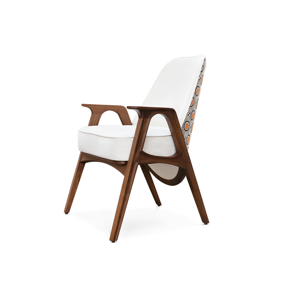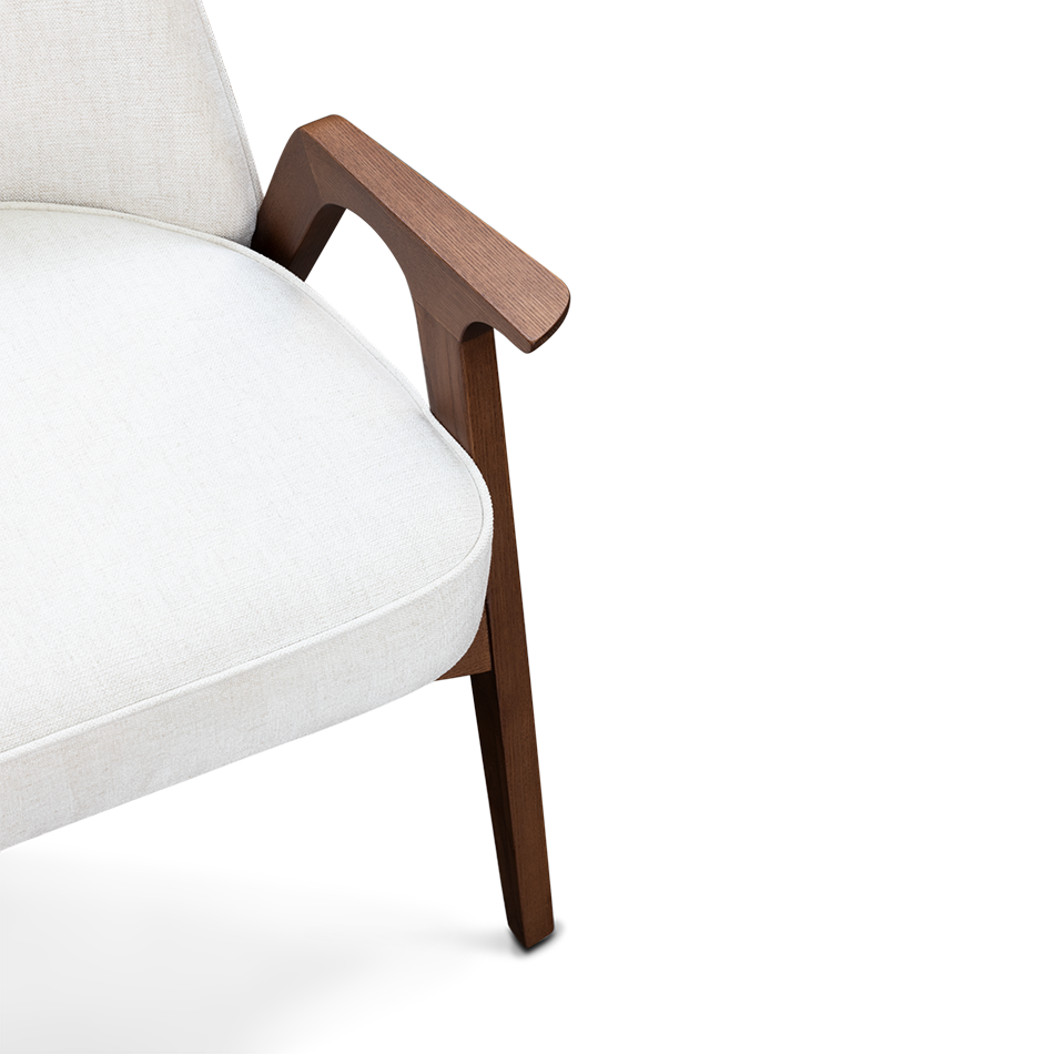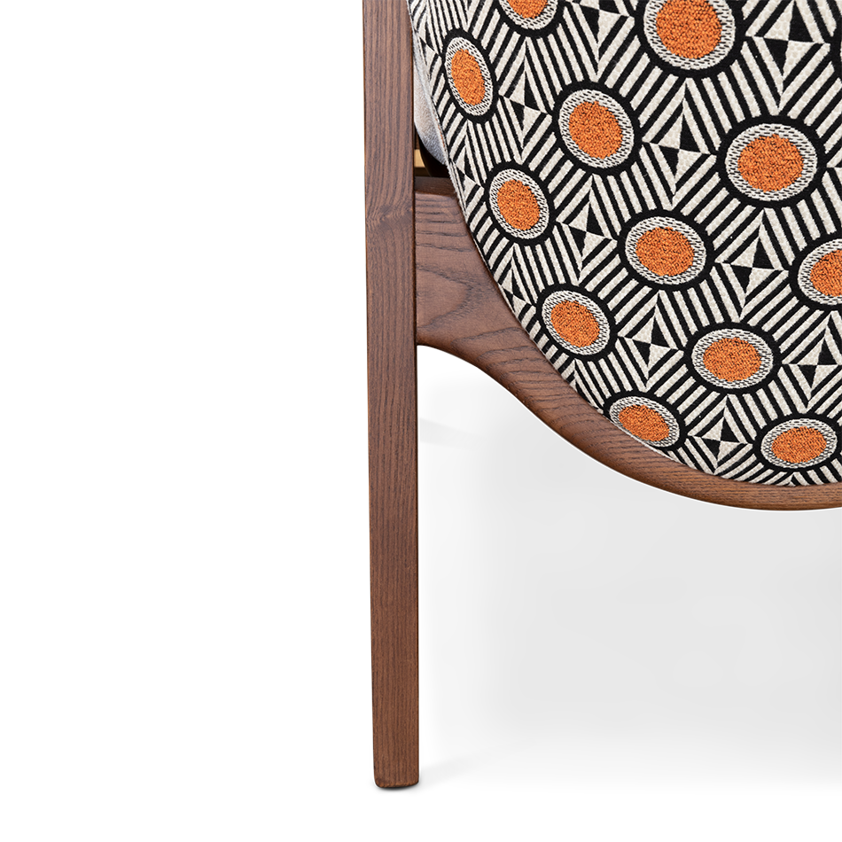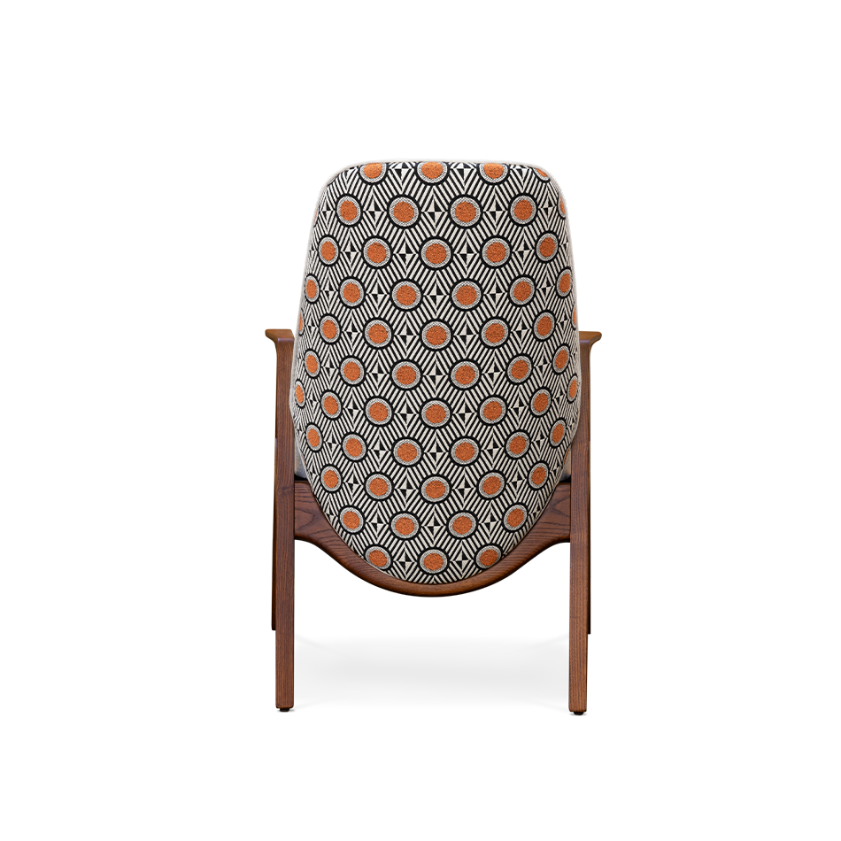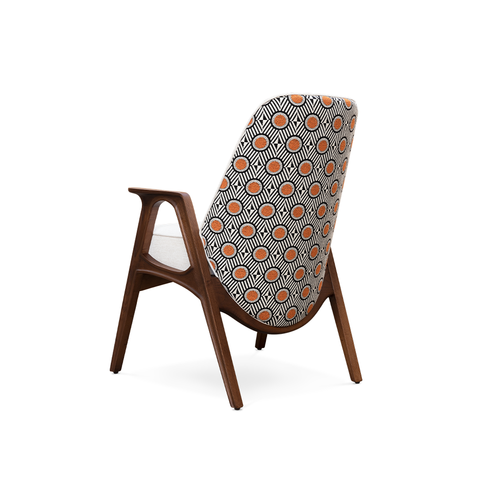 Like its family, Hadley chair reflects the best of the '30s. A timeless and flawless design. Wooden legs and armrests pair wonderfully with a customizable fabric for the seat and an art deco pattern on the back. This versatile piece is the perfect fit for a lounge or hotel lobby, or even as an accent dining chair alongside its counterpart.